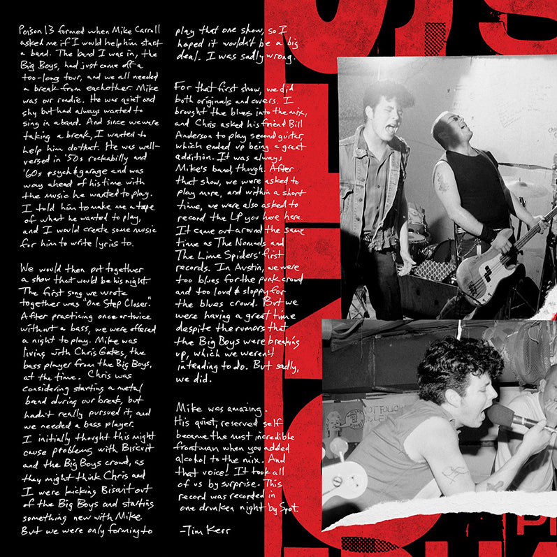 We are very excited to reissue the 1984 debut album by Poison 13 on vinyl for the first time in over 40 years. This exclusive reissue is available on black or 3-color splatter vinyl in a beautiful gatefold jacket with photography by Pat Blashill. Includes inner sleeve with the original handwritten lyrics by Mike Carroll, and brand-new liner notes by Tim Kerr.